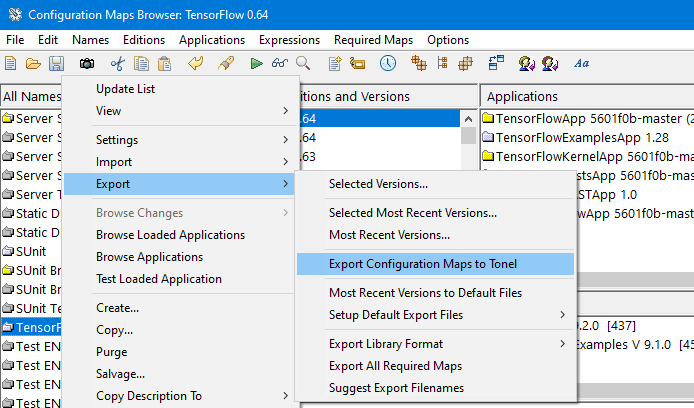 Select the Configuration Maps you want to export in the names list, and then open the contextual menu and choose Export, and then Export Configuration Maps to Tonel.