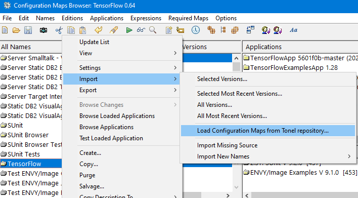 To load a Configuration Map in a Tonel repository into VAST, you have to choose the Import option in the names list, and then Load Configuration Maps from Tonel....